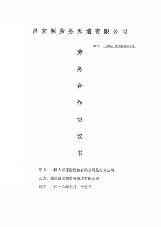 熱烈祝賀!臨汾昌宏源勞務派遣有限公司2016年7月25日在中國人壽保險股份有限公司臨汾分公司服務項目中成功合作。