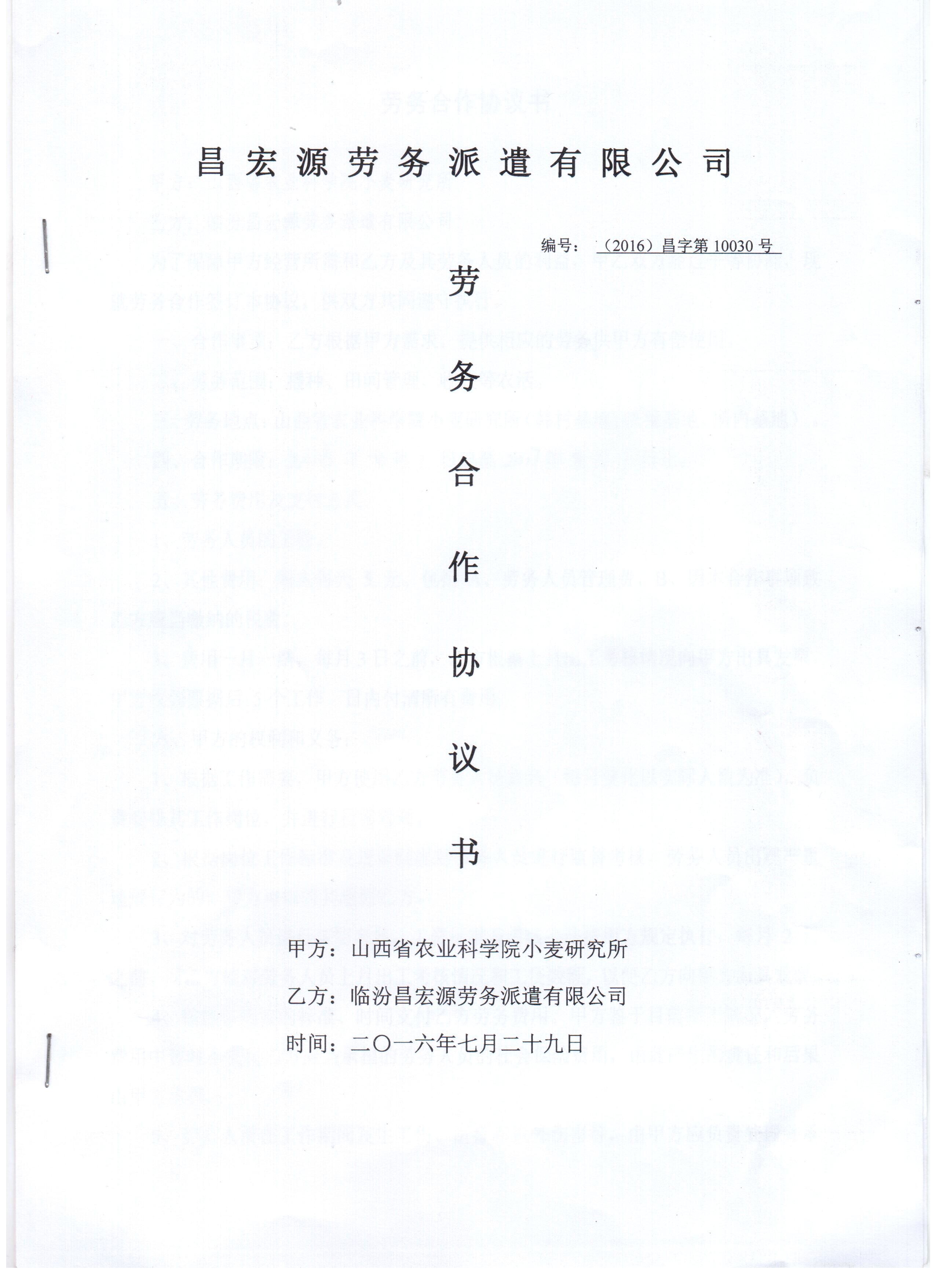 熱烈祝賀!臨汾昌宏源勞務(wù)派遣有限公司2016年7月29日與山西省農(nóng)業(yè)科學(xué)院小麥研究所成功合作。