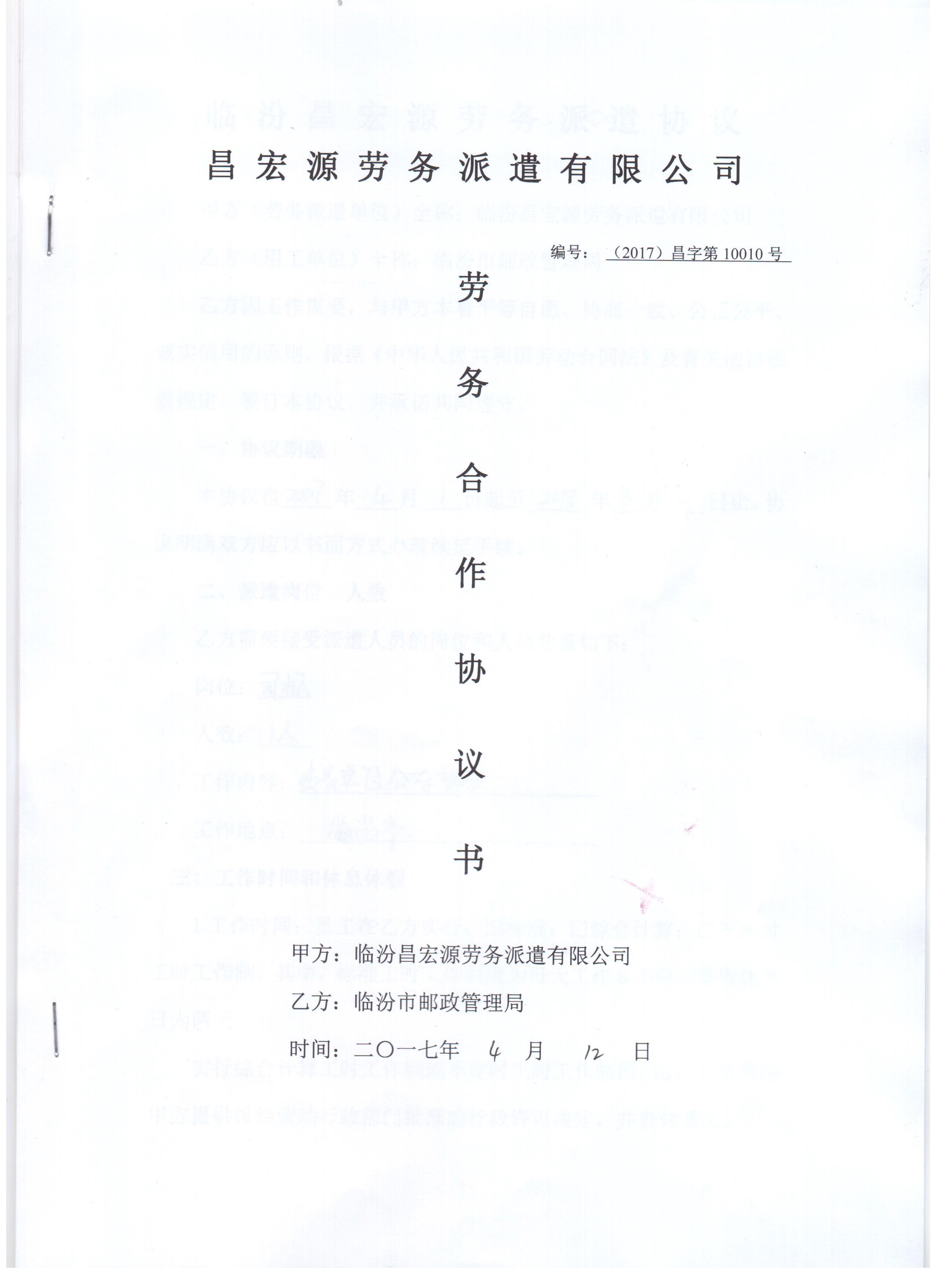 熱烈祝賀!臨汾昌宏源勞務(wù)派遣有限公司2017年4月12日在臨汾市郵政管理局服務(wù)項(xiàng)目中成功合作